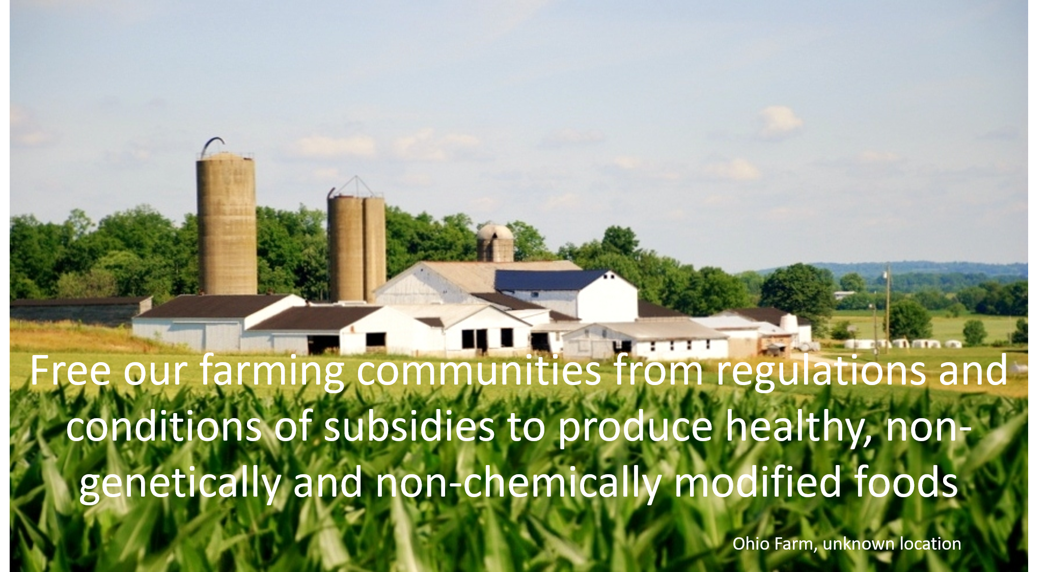 Free our farming communities from regulations and conditions of subsidies to produce healthy, non-genetically and non-chemically modified foods